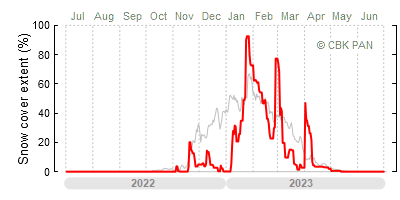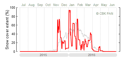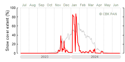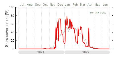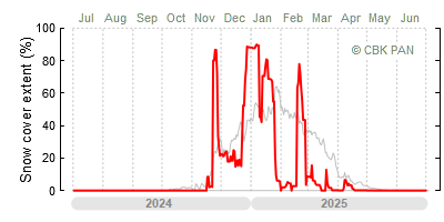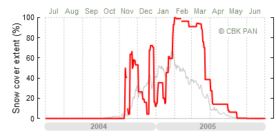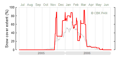 We would call a winter "harsh" if snow cover persisted for a long time and covered the largest possible area of the country. An example of such a situation in Poland is the winter of 2005/06, when snow covered almost the entire country from mid-December until the end of April. This significantly impacted the average for the entire year—statistically, on each day between July 1, 2005, and June 30, 2006, snow cover extended over as much as one-third of Poland!
