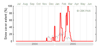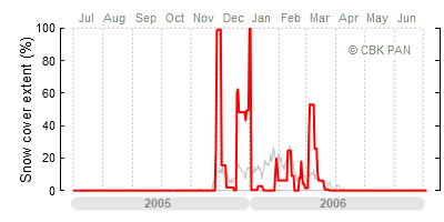 We would call a winter "harsh" if snow cover persisted for a long time and covered the largest possible area of the country. An example of such a situation in Poland is the winter of 2005/06, when snow covered almost the entire country from mid-December until the end of April. This significantly impacted the average for the entire year—statistically, on each day between July 1, 2005, and June 30, 2006, snow cover extended over as much as one-third of Poland!