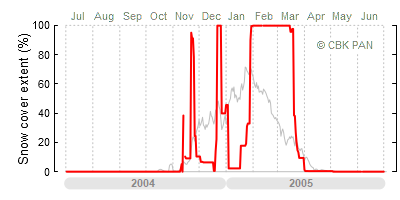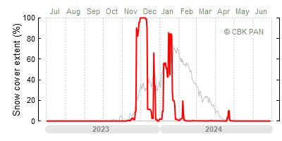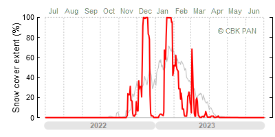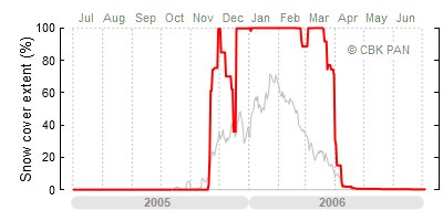 We would call a winter "harsh" if snow cover persisted for a long time and covered the largest possible area of the country. An example of such a situation in Poland is the winter of 2005/06, when snow covered almost the entire country from mid-December until the end of April. This significantly impacted the average for the entire year—statistically, on each day between July 1, 2005, and June 30, 2006, snow cover extended over as much as one-third of Poland!