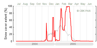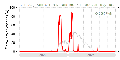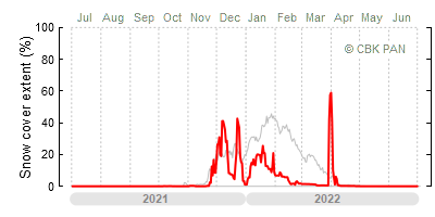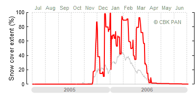 We would call a winter "harsh" if snow cover persisted for a long time and covered the largest possible area of the country. An example of such a situation in Poland is the winter of 2005/06, when snow covered almost the entire country from mid-December until the end of April. This significantly impacted the average for the entire year—statistically, on each day between July 1, 2005, and June 30, 2006, snow cover extended over as much as one-third of Poland!