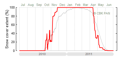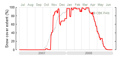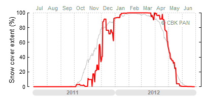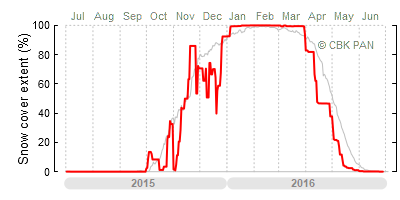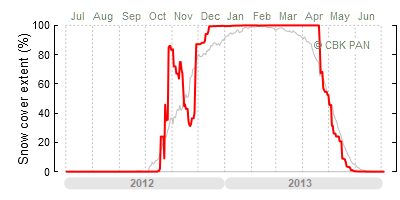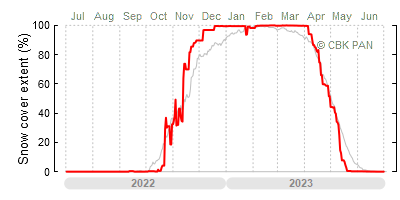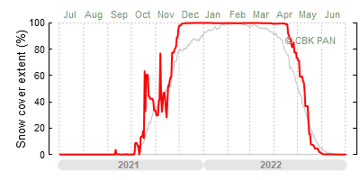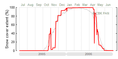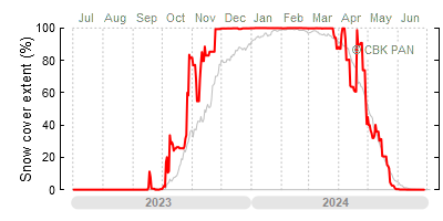 We would call a winter "harsh" if snow cover persisted for a long time and covered the largest possible area of the country. An example of such a situation in Poland is the winter of 2005/06, when snow covered almost the entire country from mid-December until the end of April. This significantly impacted the average for the entire year—statistically, on each day between July 1, 2005, and June 30, 2006, snow cover extended over as much as one-third of Poland!