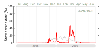 We would call a winter "harsh" if snow cover persisted for a long time and covered the largest possible area of the country. An example of such a situation in Poland is the winter of 2005/06, when snow covered almost the entire country from mid-December until the end of April. This significantly impacted the average for the entire year—statistically, on each day between July 1, 2005, and June 30, 2006, snow cover extended over as much as one-third of Poland!