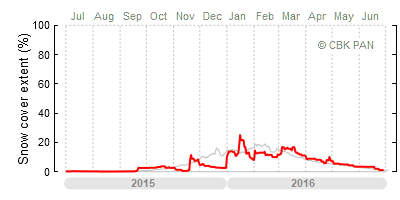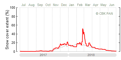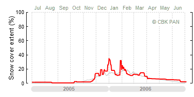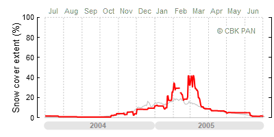 We would call a winter "harsh" if snow cover persisted for a long time and covered the largest possible area of the country. An example of such a situation in Poland is the winter of 2005/06, when snow covered almost the entire country from mid-December until the end of April. This significantly impacted the average for the entire year—statistically, on each day between July 1, 2005, and June 30, 2006, snow cover extended over as much as one-third of Poland!