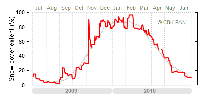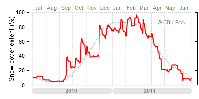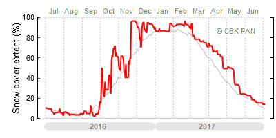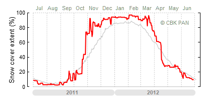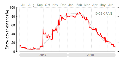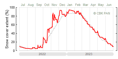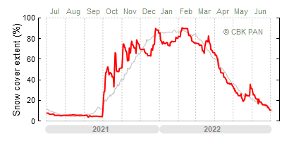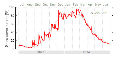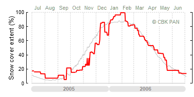 We would call a winter "harsh" if snow cover persisted for a long time and covered the largest possible area of the country. An example of such a situation in Poland is the winter of 2005/06, when snow covered almost the entire country from mid-December until the end of April. This significantly impacted the average for the entire year—statistically, on each day between July 1, 2005, and June 30, 2006, snow cover extended over as much as one-third of Poland!