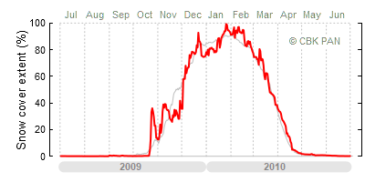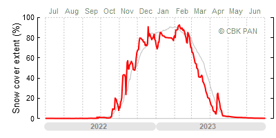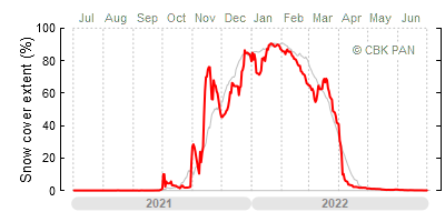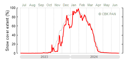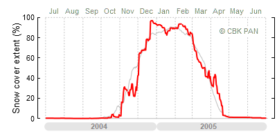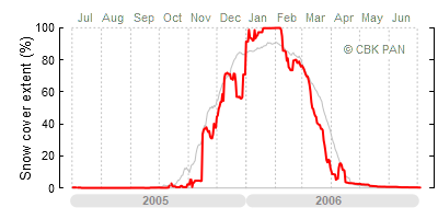 We would call a winter "harsh" if snow cover persisted for a long time and covered the largest possible area of the country. An example of such a situation in Poland is the winter of 2005/06, when snow covered almost the entire country from mid-December until the end of April. This significantly impacted the average for the entire year—statistically, on each day between July 1, 2005, and June 30, 2006, snow cover extended over as much as one-third of Poland!