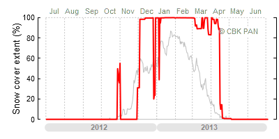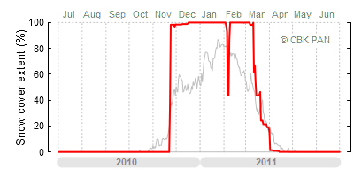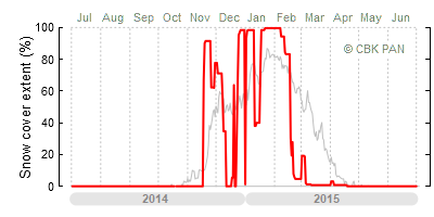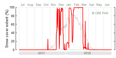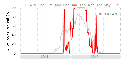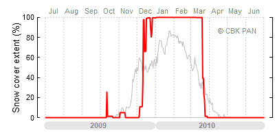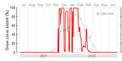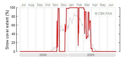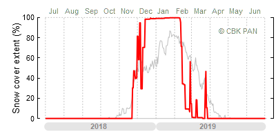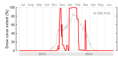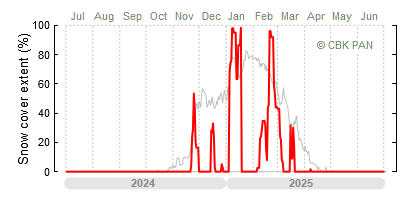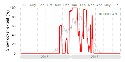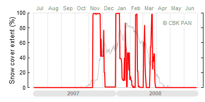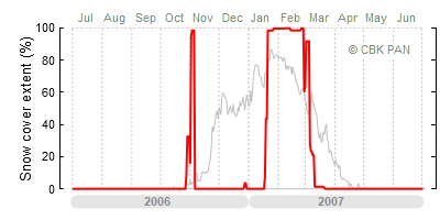 A mild winter is one where snow cover appears and quickly disappears, only occasionally covering more than 80-90 percent of the country. A good example of such a situation is the winter in Poland during the 2006/07 season, when snow appeared on a larger scale only at the turn of January and February.
