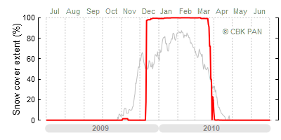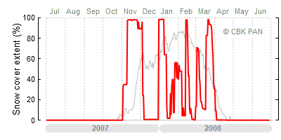 A mild winter is one where snow cover appears and quickly disappears, only occasionally covering more than 80-90 percent of the country. A good example of such a situation is the winter in Poland during the 2006/07 season, when snow appeared on a larger scale only at the turn of January and February.