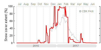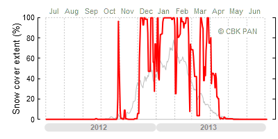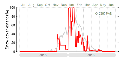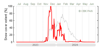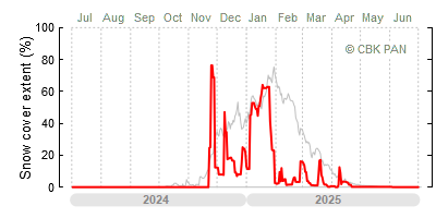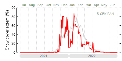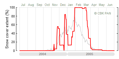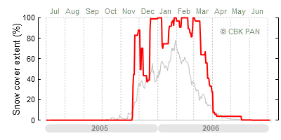 We would call a winter "harsh" if snow cover persisted for a long time and covered the largest possible area of the country. An example of such a situation in Poland is the winter of 2005/06, when snow covered almost the entire country from mid-December until the end of April. This significantly impacted the average for the entire year—statistically, on each day between July 1, 2005, and June 30, 2006, snow cover extended over as much as one-third of Poland!