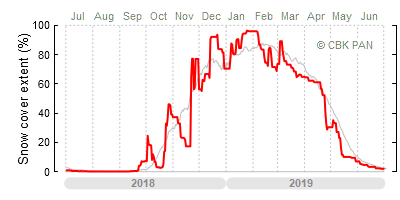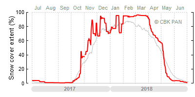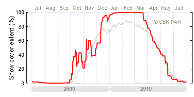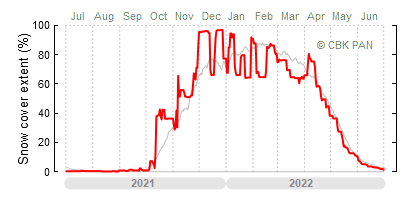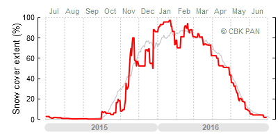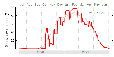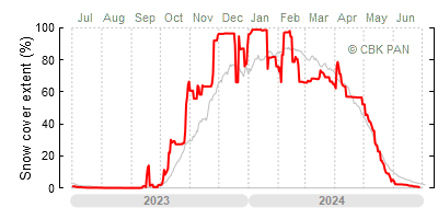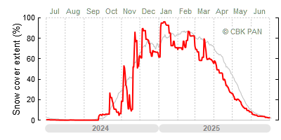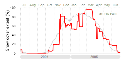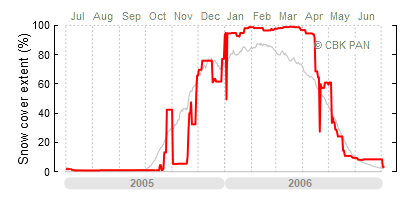 We would call a winter "harsh" if snow cover persisted for a long time and covered the largest possible area of the country. An example of such a situation in Poland is the winter of 2005/06, when snow covered almost the entire country from mid-December until the end of April. This significantly impacted the average for the entire year—statistically, on each day between July 1, 2005, and June 30, 2006, snow cover extended over as much as one-third of Poland!