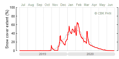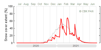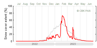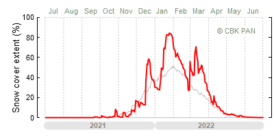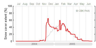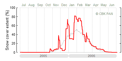 We would call a winter "harsh" if snow cover persisted for a long time and covered the largest possible area of the country. An example of such a situation in Poland is the winter of 2005/06, when snow covered almost the entire country from mid-December until the end of April. This significantly impacted the average for the entire year—statistically, on each day between July 1, 2005, and June 30, 2006, snow cover extended over as much as one-third of Poland!