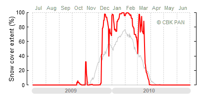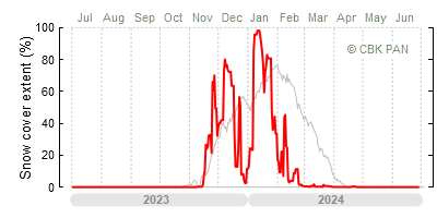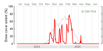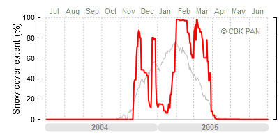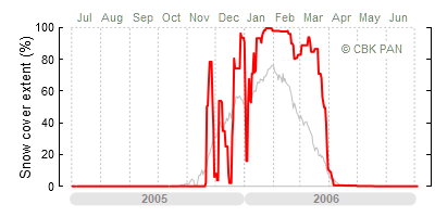 We would call a winter "harsh" if snow cover persisted for a long time and covered the largest possible area of the country. An example of such a situation in Poland is the winter of 2005/06, when snow covered almost the entire country from mid-December until the end of April. This significantly impacted the average for the entire year—statistically, on each day between July 1, 2005, and June 30, 2006, snow cover extended over as much as one-third of Poland!